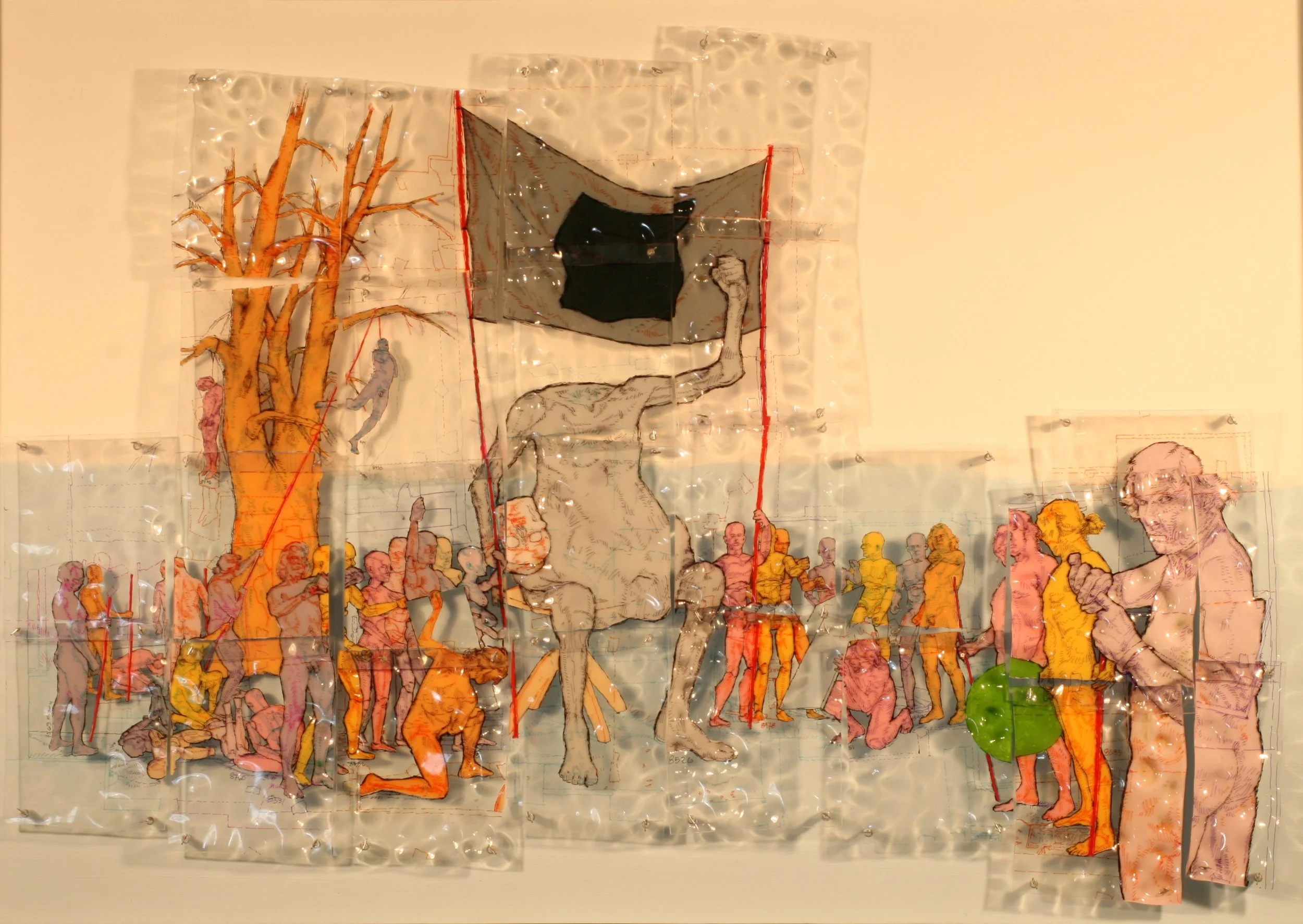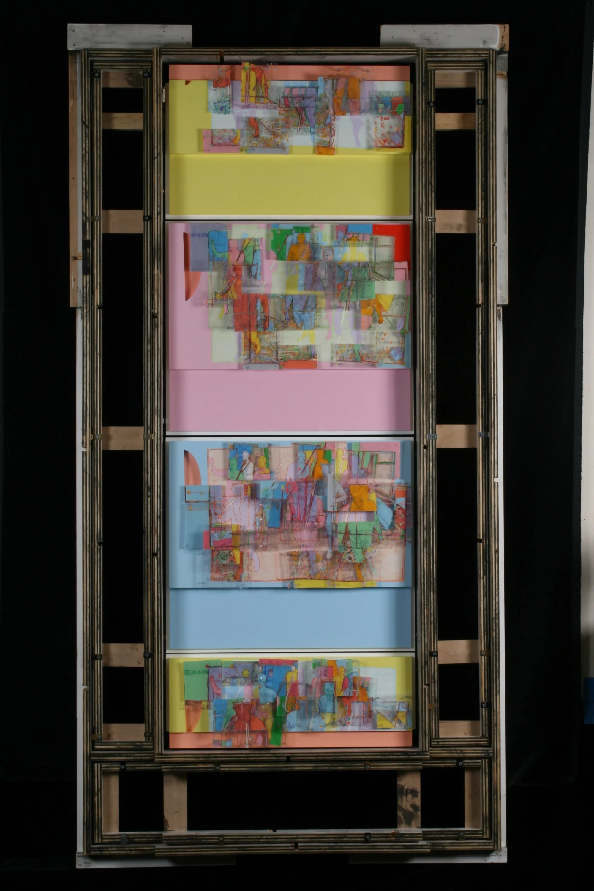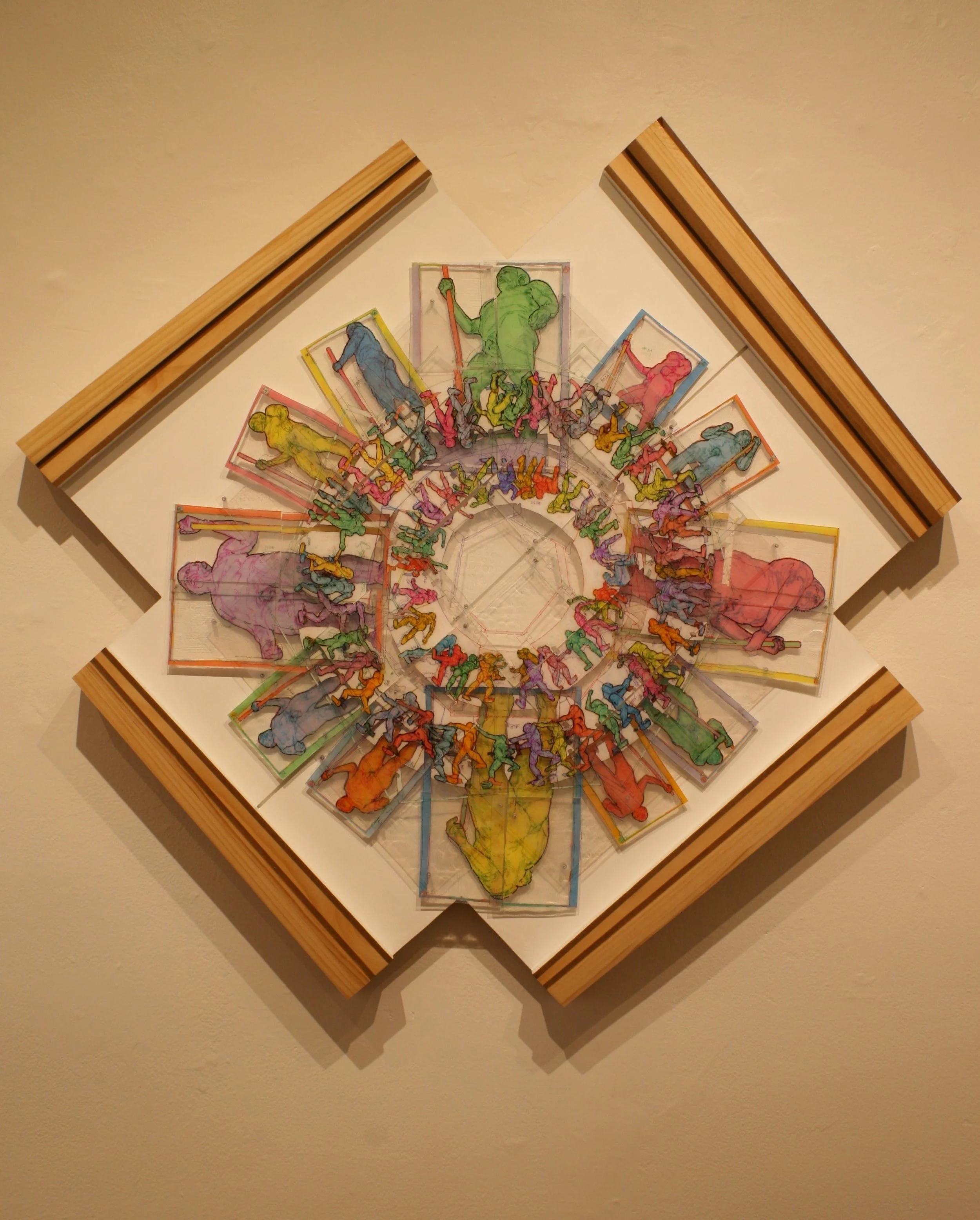 Acrylic Paint and Ink on Salvaged Wood, Lacquer and Ink on Shrink Plastic