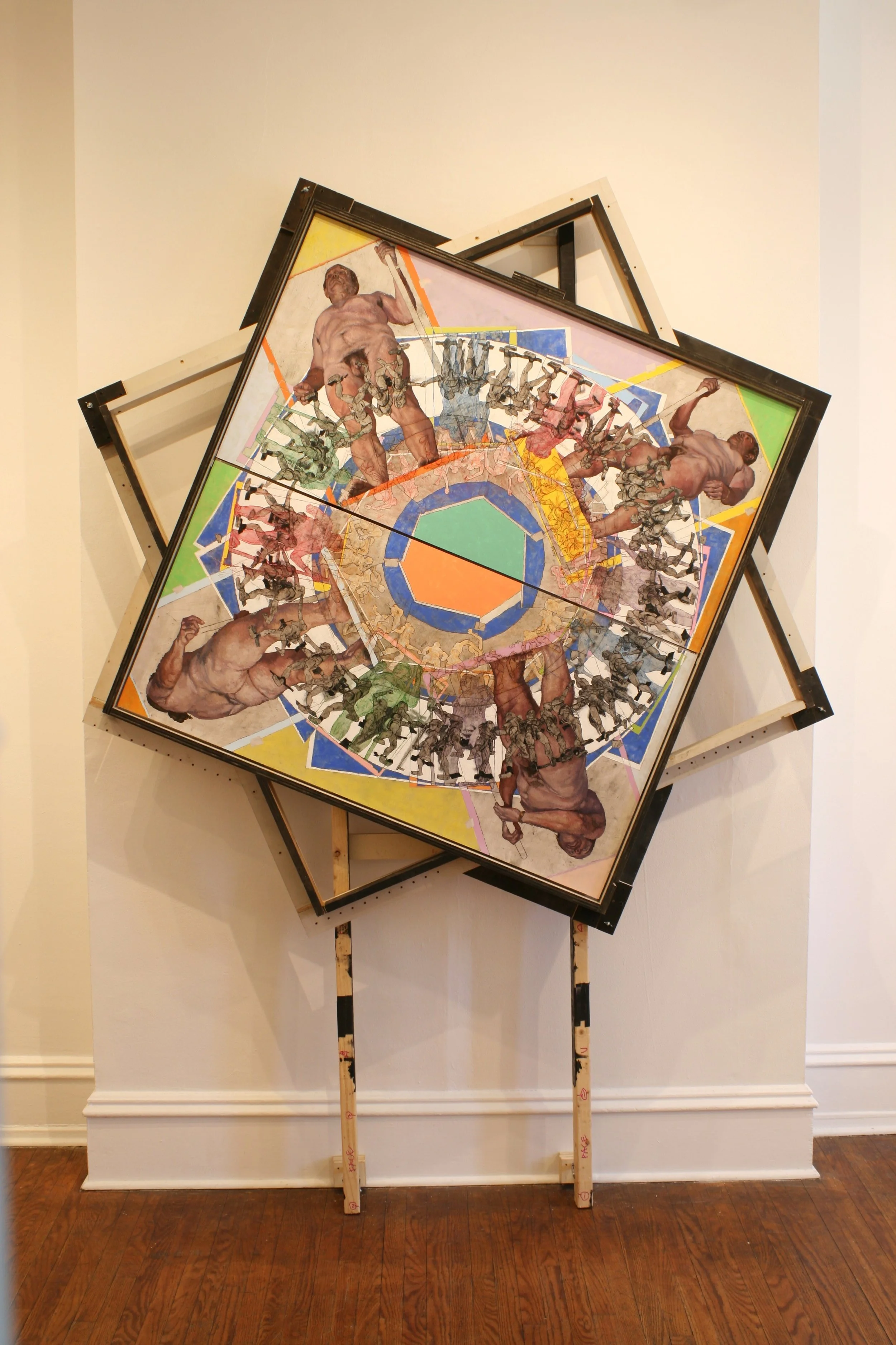 Acrylic Paint and Ink on Salvaged Canvas and Wood